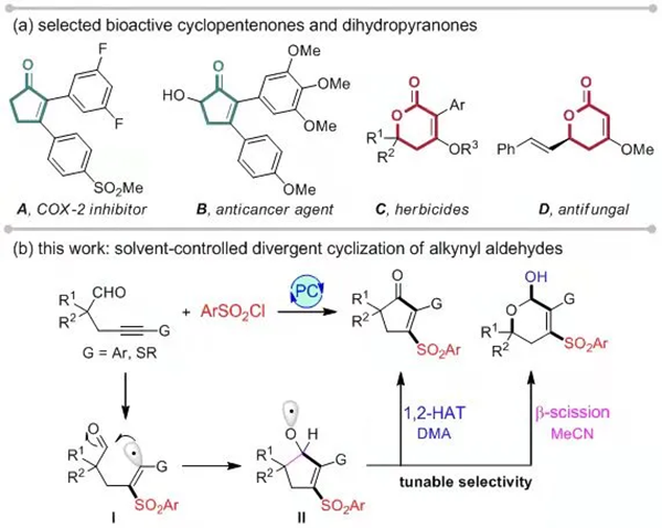 另外,朱钢国教授课题组还与南开大学薛小松课题组合作,在国际著名化学期刊Chemical Science上发表题为“Solvent-controlled photocatalytic divergent cyclization of alkynyl aldehydes: access to cyclopentenones and dihydropyranols”(Chem. Sci. 2021, 12, 11420)。Chemical Science是英国皇家化学会旗舰期刊,最新影响因子9.8,SCI分区属化学类一区。